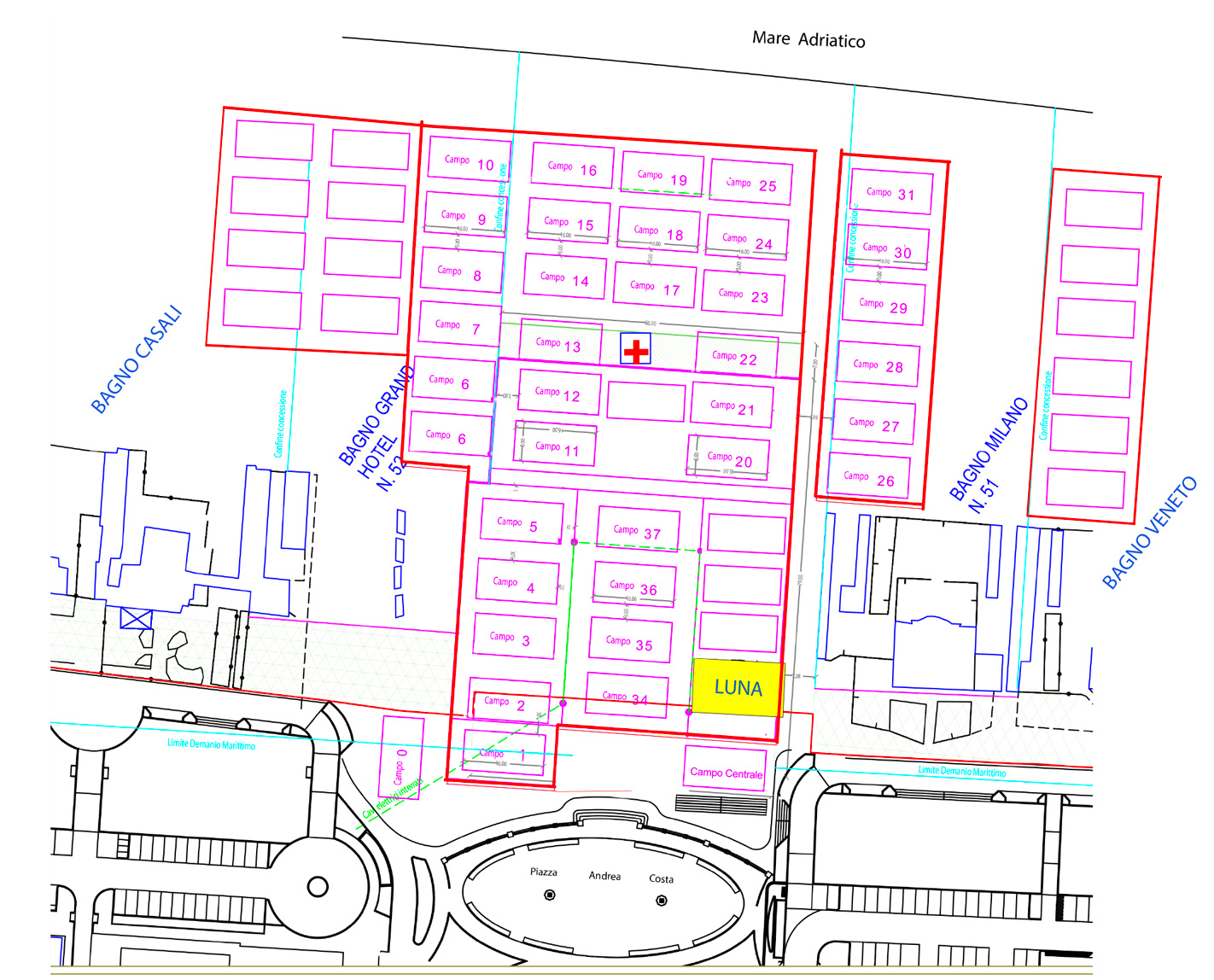 La Beach Arena sorge sull’arenile demaniale adiacente a Piazza Andrea Costa a Cesenatico, con una tribuna e sedute da 400 posti.